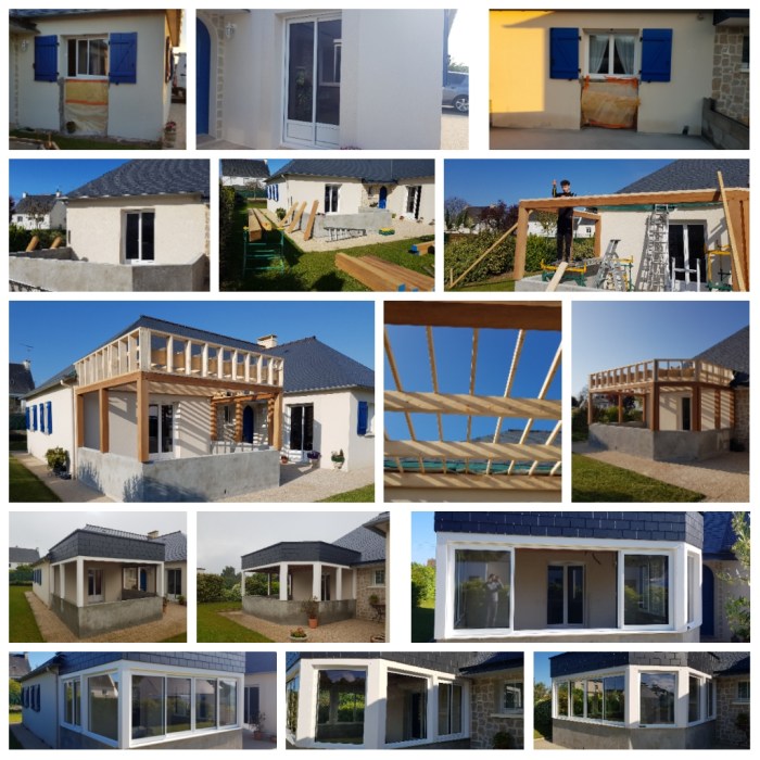 Extension véranda sur le secteur de Pleneuf Val André : modification des ouvertures existantes, façonnage d’une charpente avec ossature bois pour bandeau, pose de menuiseries en Aluminium, isolation laine de verre et pose d’un revêtement intérieur en plaque de plâtre.