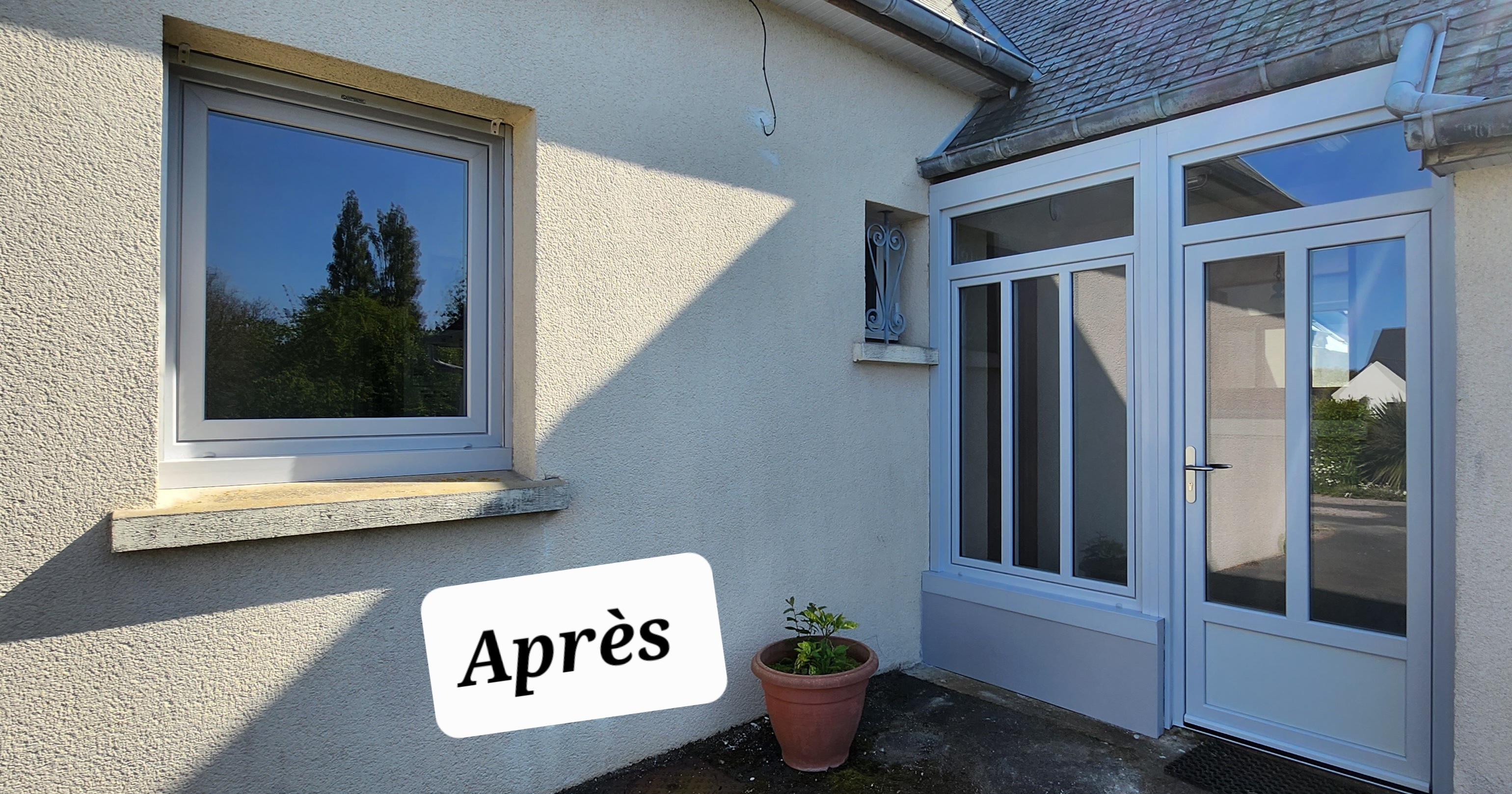 Remplacement d’anciennes menuiseries bois simple vitrage par des neuves en PVC gris teinté dans la masse double vitrage.